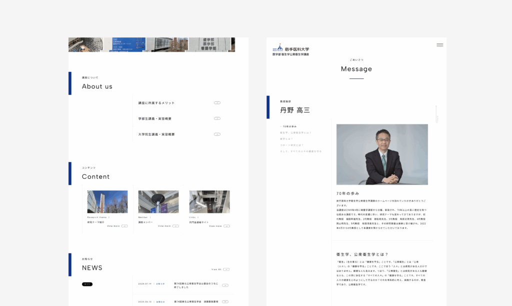 その上で、テンプレートのデザイン特性を活かしつつ、公衆衛生学講座の研究領域に合う落ち着いた色調・余白設計へ調整を行いました。