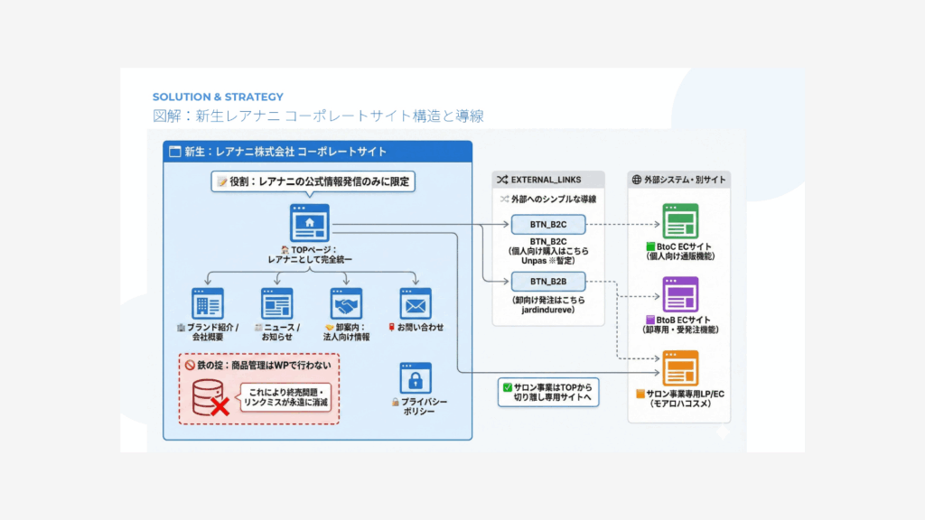 次に、PDFレポートにも記載した通り、 2つの出口(BtoC・BtoB)への最短誘導設計を構築。 商品情報の管理はWordPress上で行わず、外部ECへ一元化することで、 終売管理・リンクミス・二重運用の負荷を完全に撤廃しました。