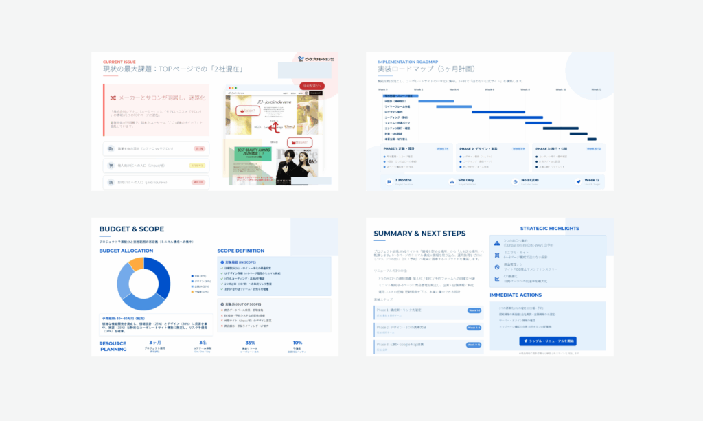 レアナニ様のWebリニューアルでは、メーカーとサロン情報の混在という根本課題を明確化し、レアナニ公式の情報発信に特化した「迷わないコーポレートサイト」への再構築方針を策定しました。