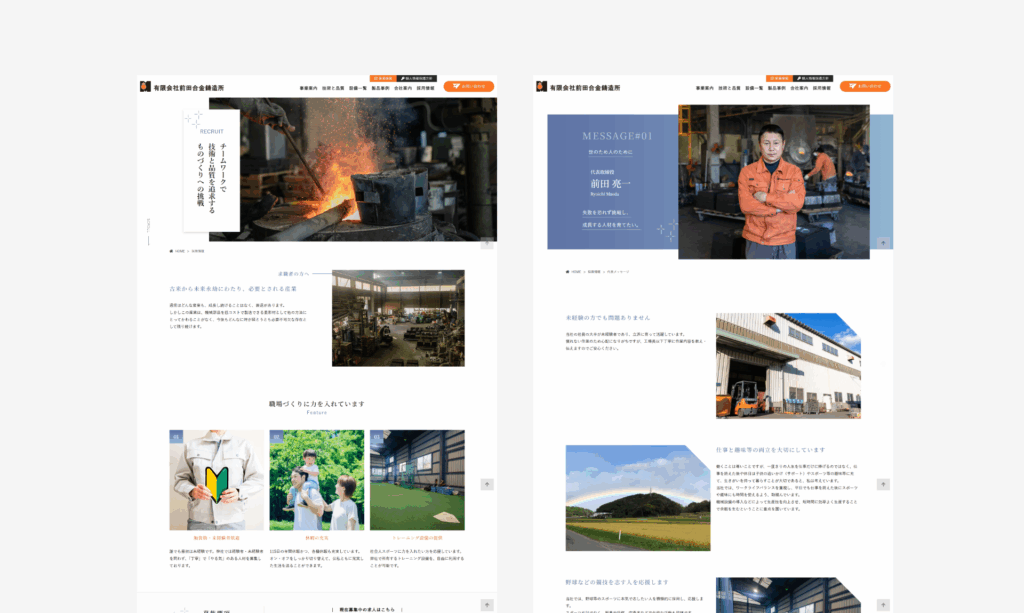 このWebサイトでは、採用を主軸に「鋳造の仕事」と「働く人の姿」が伝わる構成を重視しました。仕事内容を工程ごとに整理し、現場の雰囲気や人の存在が感じられるデザインで、未経験者でも働くイメージが湧く採用Webを構築しています。