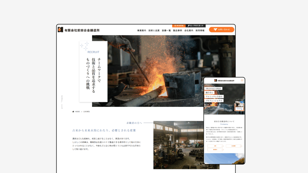 奥州市で鋳造業を営む前田合金鋳造所様のコーポレートサイト兼採用サイトを制作しました。これまでWeb上では、鋳造という仕事の中身や現場の雰囲気が十分に伝わっておらず、採用においても「どんな仕事をする会社なのか」「どんな人が働いているのか」がイメージしにくい状態でした。